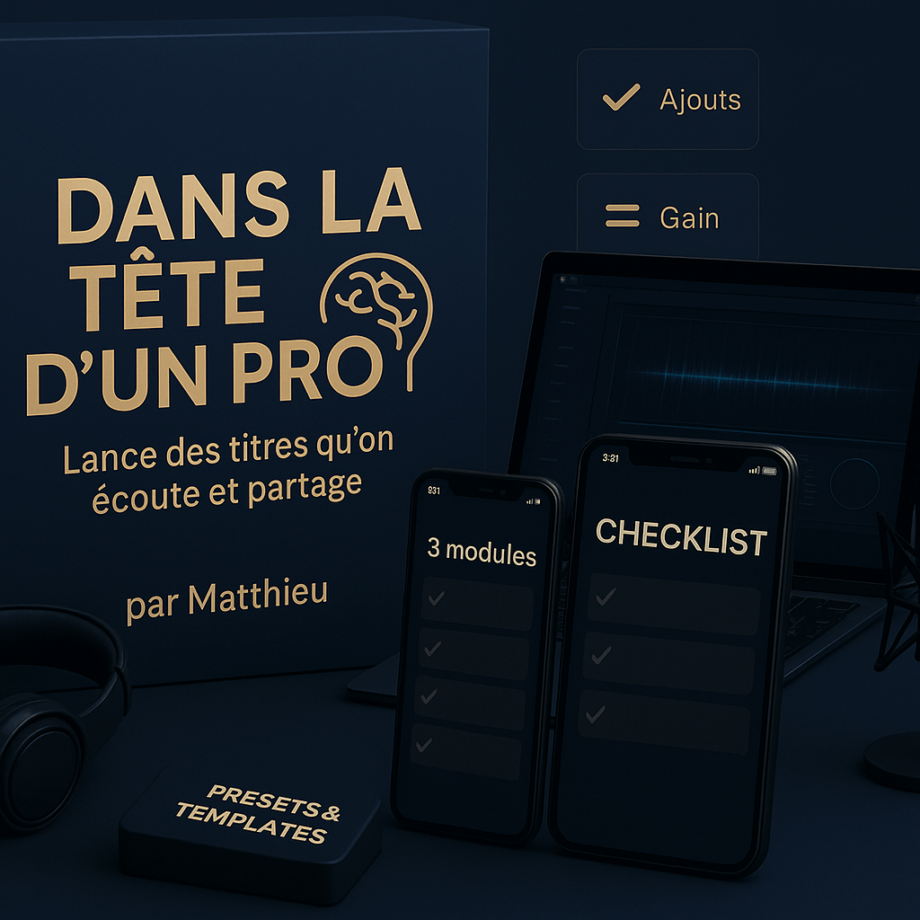 Le Process Répétable "1 Son / 7 Jours" — Le framework complet pour appliquer le calibrage d'ajout à chaque morceau, dans l'ordre, sans te perdre. Templates prêts à l'emploi, checklists mix/arrangement orientées ajout, tests A/B concrets. Tu répliques le même niveau d'impact à chaque sortie.